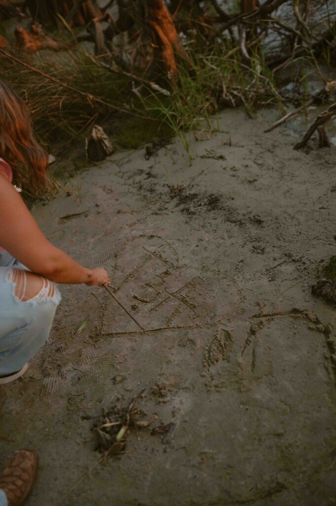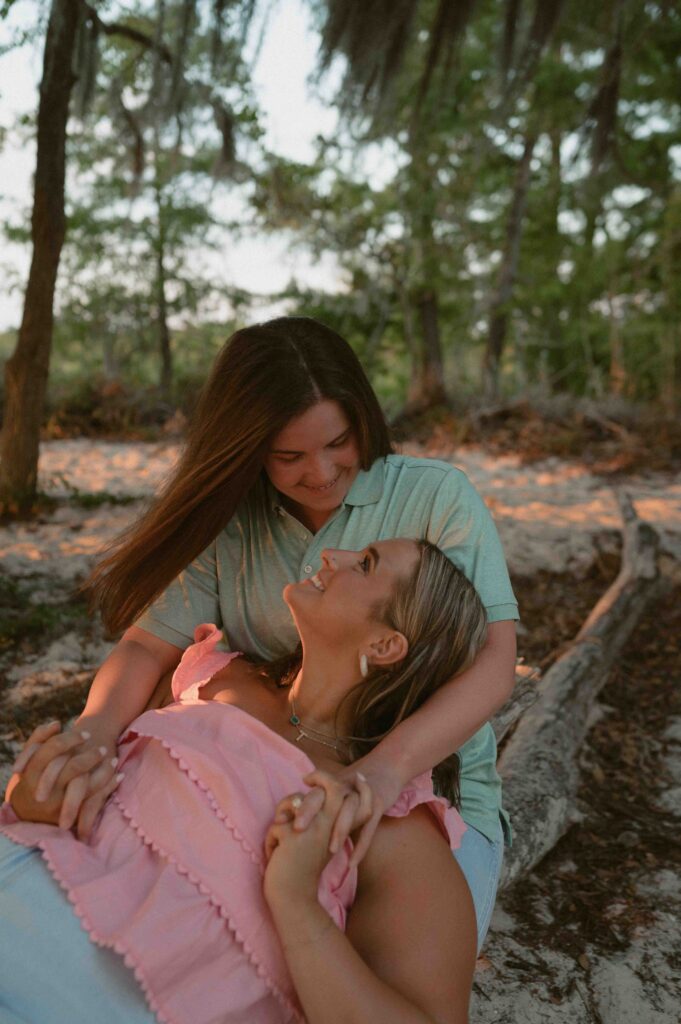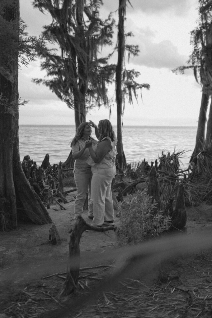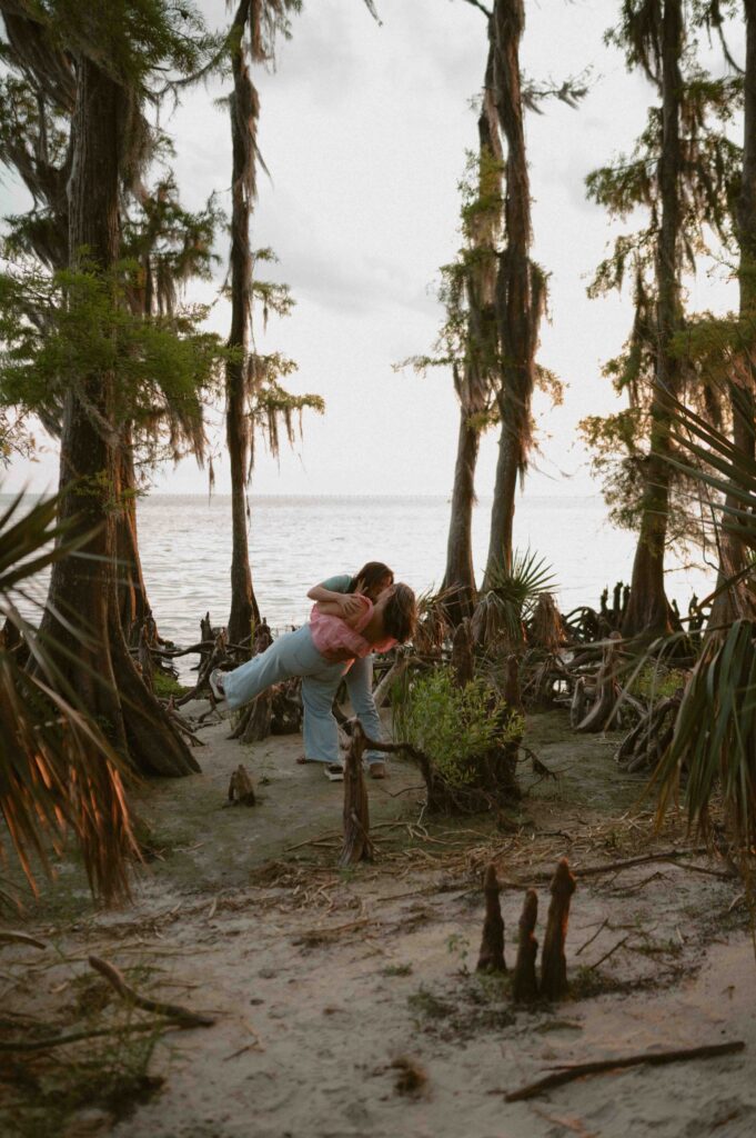 In the midst of wedding planning, hectic schedules, and life in general, we don’t often get dedicated one-on-one time with our partners. Date nights are often few and far between, which is why I want this to feel like a date. I always start my sessions by saying “I want you to feel like you’re on a date. So, interact with each other. Talk, laugh, play, and let yourself have this time together.”, and these two quite literally understood the assignment. Throughout the entire session, their love for each other and genuine chemistry was so palpable and so easily photographed. Alexis and Taylor spent the day running around on the beach, dancing under the cypress trees, drawing hearts with their initials in the sand, and melting into each other while watching the sunset on the water.